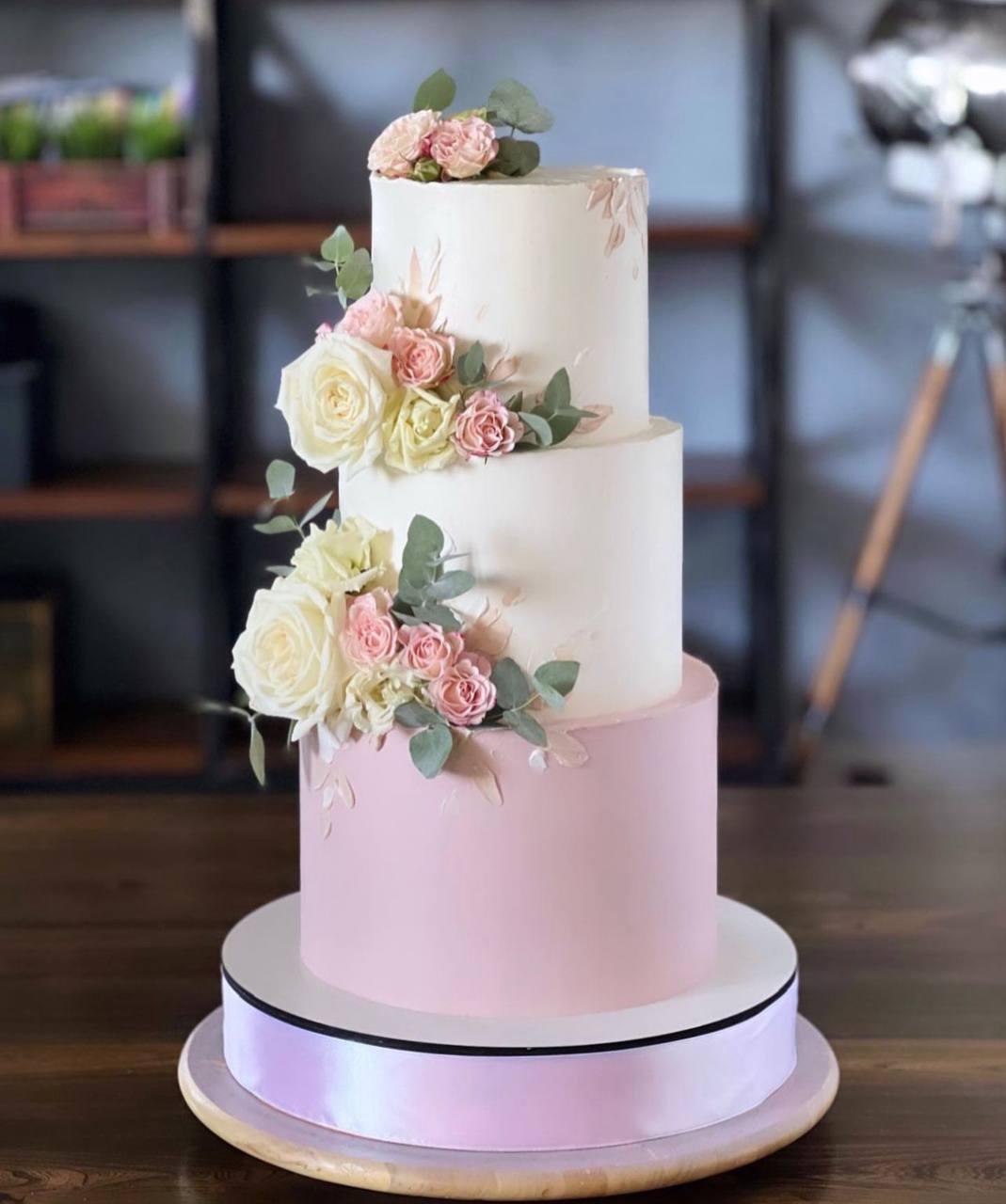 Этот свадебный торт, украшенный цветами, станет настоящим украшением праздника, радуя глаз молодожёнов и гостей своей красотой и изысканностью.